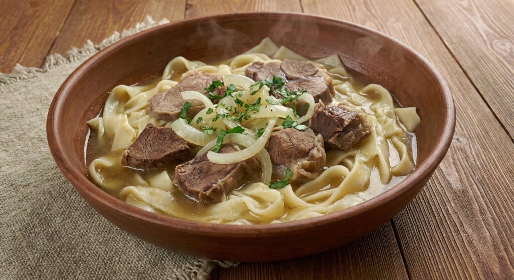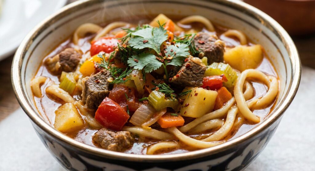 スープたっぷりの「スープラグマン」と、炒め麺のような「ボソ・ラグマン」があり、どちらも非常に人気があります。シルクロードを通じて伝わった、うどんのルーツの一つとも言われています。
