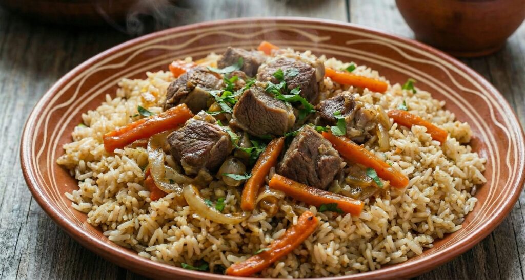 肉、人参、玉ねぎをお米と一緒に大鍋で炊き込んだ、中央アジア風の豪華なピラフです。