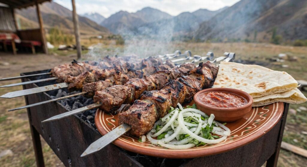 スパイスや玉ねぎでマリネした肉の塊を、長い鉄串に刺して炭火で豪快に焼き上げる中央アジア流BBQです。